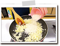 白ワインを入れてざっと炒め、アルコール分を飛ばす。 |