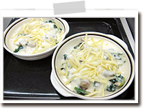 具材はあらかじめ加熱しておくこと、ホワイトソースの一部で和えてからグラタン皿に入れることがポイントです。 |