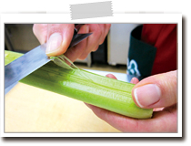茎にある筋を取ります。切り口のところに筋の先が見えるので、包丁で持ち上げるようにして、スーッと引いてください。口当たりをよくするものである為、大まかで構いません。