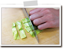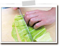 キャベツは、縦1㎝幅に切り、横に向きを変えて1㎝幅に切る。