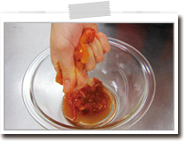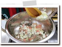 トマトのホール缶をつぶしながら入れ、塩で味をととのえる。さらに、約10分煮込む。