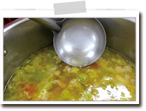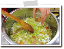 具沢山スープは、野菜が同時に煮えるように切り方を調節するのがコツです。