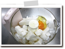 卵は、砂糖と触れることで水分を奪われてしまう為、全て材料を入れてから攪拌する直前で加えます。