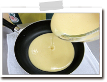 薄くサラダ油を塗ったフライパンを十分に熱し、ぬれた布巾の上にのせて粗熱を取る。