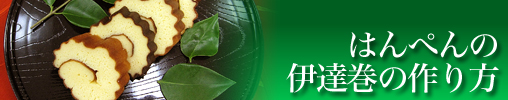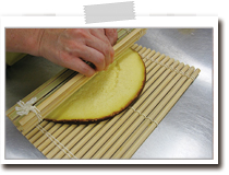 焼き上がったら、すだれの上に焼き色のついた方が上になるようにのせ、手前からくるくるとしっかり巻き、両端を輪ゴムで止めてそのまま冷ます。