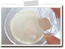 小さな入れ物にぬるま湯、ドライイースト、計量した砂糖からひとつまみ入れてよくまぜ合わせイースト水をつくる。