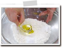 大きなボウルに薄力粉と強力粉を入れて塩と砂糖を間隔をあけてのせ、真ん中をくぼませてオリーブ油を流し入れる。砂糖の上から②のイースト水を流し入れ、手早くかき混ぜ外側から内側に向かって円を描くように混ぜ、粉っぽさがなくなり、ひとかたまりなるように手早く混ぜる。