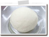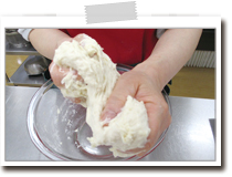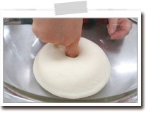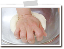ひとまとめにした生地を両手で持ち、ふきんを洗う時のようにもむ。生地に弾力がでてきたらボウルの中で手のひらのつけ根を使い生地をぐっと押してこねる。生地を折り返してを繰り返してよくなじんだら、生地のはしをもちボウルの底にたたきつける。もっている生地をたたきつけた生地に折り合わせ、合わせた横の端をもちボウルにたたきつける。これを繰り返し、生地がなめらかになったら丸くまとめ、まとめ口を下にしてボウルにおく。