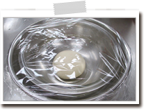 生地の入ったボウルより一回り大きなボウルに30℃位のお湯をはり、生地の入ったボウルをのせ、ラップで外側のボウルごと覆って1次発酵させる。湯が冷めたら取り替えて生地が2倍くらいに膨らんだら、発酵具合を確認する。