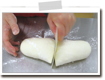 分割するときはスケッパーや包丁などでスパッときります。ちぎると粘りと弾力のできたグルテンを壊してしまい、ふっくらとしたパンができなくなってしまいます。