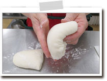 手に粉をつけ生地を両手で持ち、生地の表面を伸ばしてから切り口を下に送り込み丸くする。