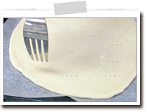 オーブンシートをしいた天板に丸くのばした生地をのせ、フォークで生地に穴をあける