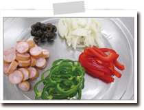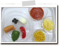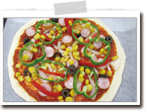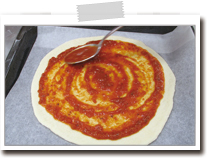 生地にトマトソースをふち1㎝を残し塗り広げる。具材を均等にのせ、最後にチーズをのせる。