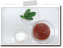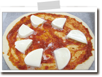 モッツアレラは10等分に切り、②と同じようにピザソースをぬり広げた生地にのせる。