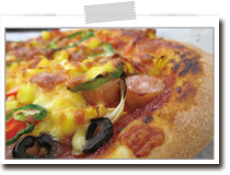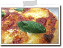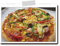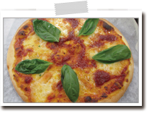 トマトソースはふち1㎝を残して塗り広げ、具材を載せてチーズをのせ、220℃に熱したオーブンで10分焼く。