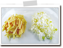かにの身は軟骨を除く。長ねぎは粗みじん切り、ゆでたけのこは洗って細く切る。グリンピースは色よくゆでておく。(グリンピースは冷凍の場合はさっと湯通しする) |