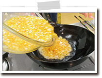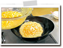 ※卵は火の通りが早いので少しずつ入れると入れ始めと終わりで均一に火が通らないのでふんわりと仕上がらない。また、卵液を入れて大きくかき混ぜると卵液に油が混じって柔らかく口当たりよくなります。