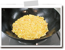 中華鍋をよく熱し油半量を入れ鍋全体に油をなじませ、うすく煙が出るくらい熱したら②の半量を一気に流し入れ、卵の周りが固まってふくらんできたら大きく混ぜ、全体が半熟状になったら丸く形をととのえる。