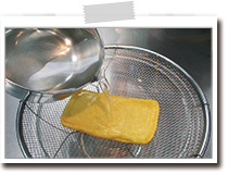 油揚げは両面に熱湯をかけ油抜きをし、縦半分に切り7㎜幅に切る。