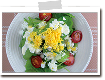 器に野菜を盛り付けて白身と黄身をのせドレッシングをかけます。 |
