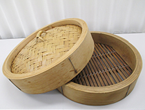竹製の蒸し器。中華鍋に湯をはりせいろをのせ蒸します。ふたは竹で編んであるので蒸気が適度に抜け火のあたりがやわらかくふっくらと仕上がります。
