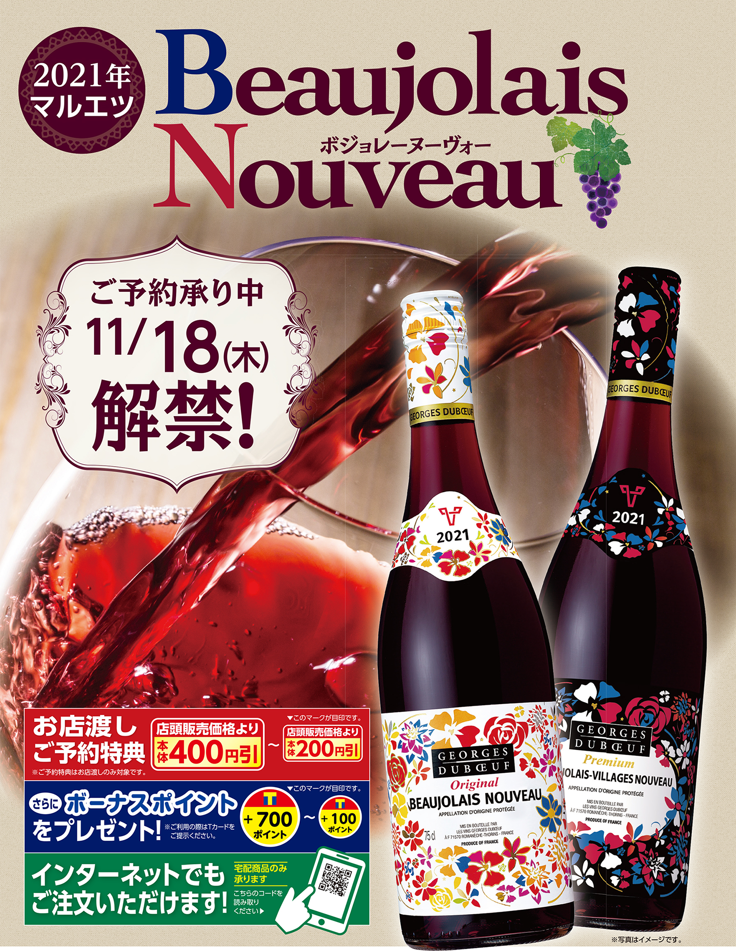 「ボジョレーヌーヴォー」は2021年11月6日(土)18:00をもちまして、承り終了いたしました。たくさんのご利用、誠にありがとうございました。