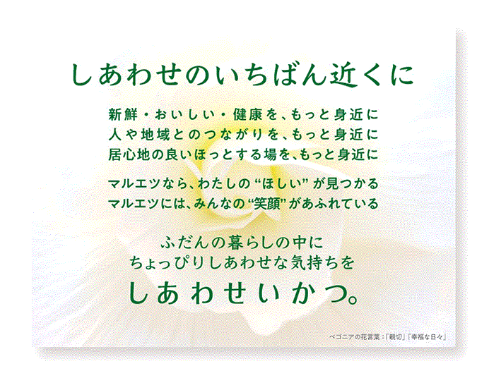 マルエツは、将来、わたしたちが目指す姿を≪ありたい姿≫として明文化し、活動指針としています。ブランドメッセージである「しあわせいかつ。」をもとに、お客さま、従業員、そして地域の暮らしを支える「いちばん近い存在」になりたいという想いが込められています。