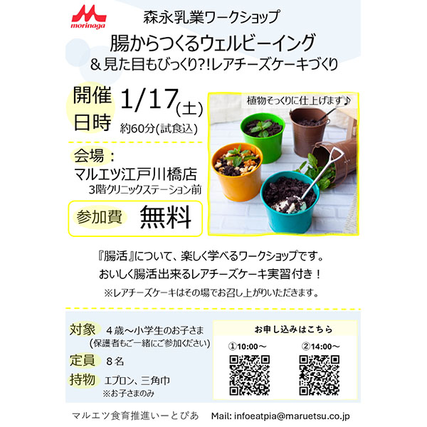 腸についてのお話やクイズとレアチーズケーキを作りを通して、楽しく生き生きとした健康生活を親子で体験いただくワークショップです。