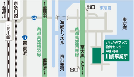 お車の場合:首都高速湾岸線「東扇島」インターから約5分、川崎産業道路から川崎海底トンネルを抜けて、かわさきファズを目指してください。 |