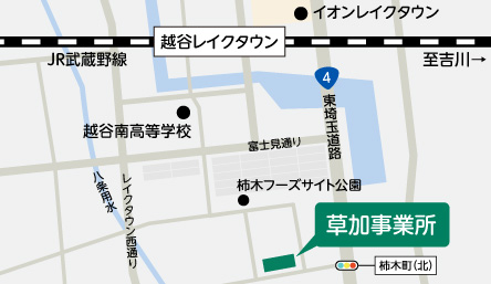 お車の場合:国道4号東埼玉道路「柿木町北」交差点を、草加方面からお越しの方は「左折」、越谷方面からお越しの方は「右折」、100mほど直進後一つ目角を右折し、センター駐車場よりお入りください。 |