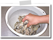 | カキの洗い方にはいろいろな方法がありますが、今回はご家庭で簡単に出来る方法を提案致します。 |