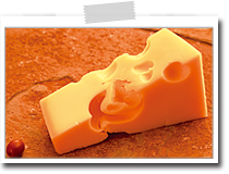 絵本などでよく目にする穴の開いたチーズはエメンタールです。20℃と高めの温度で熟成させるので、炭酸ガスが発生するためにチーズ内に穴(チーズアイ)が開きます。チーズアイの中に水滴があることがありますが、これは『天使の涙』と呼ばれ、珍重されます。 |