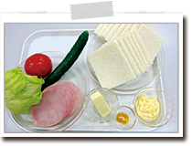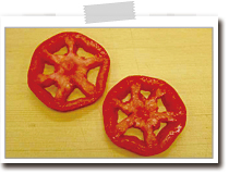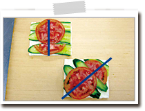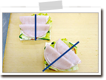 きゅうりと同様に、トマトとハムはサンドイッチの切り口に断面が大きく見えるように並べます。 |