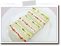 生クリームは砂糖を加えて8分立て(泡立て器ですくった時、先端の角が曲がるくらいの状態)にし、7枚のパンの片面にぬる。5mmの厚さに果物をスライスして並べ、さらに上から生クリームをぬり、パンを重ねる。 |
