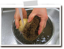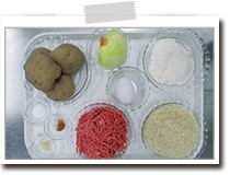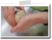 ※小麦粉は薄く均一につけましょう。まだらについていると卵、パン粉がつきにくく、揚げた時の破裂の原因になります。 |