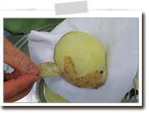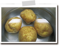 じゃが芋は皮ごとよく洗い丸ごとゆでるか、蒸し器で蒸す。竹串を刺してスーッと刺せる状態になったら出来上がり。