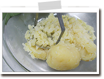 じゃが芋は熱いうちに皮をむいてマッシャーやフォークでつぶす。(皮は多少残っていてもよい)