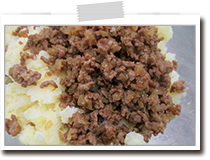 玉ねぎはみじん切りにし、油で炒め薄く色づくくらいまでしっかり炒め、ひき肉を入れ炒める。ひき肉の水分がなくなる位まで炒めAを入れ味をつけ、冷ましておく。