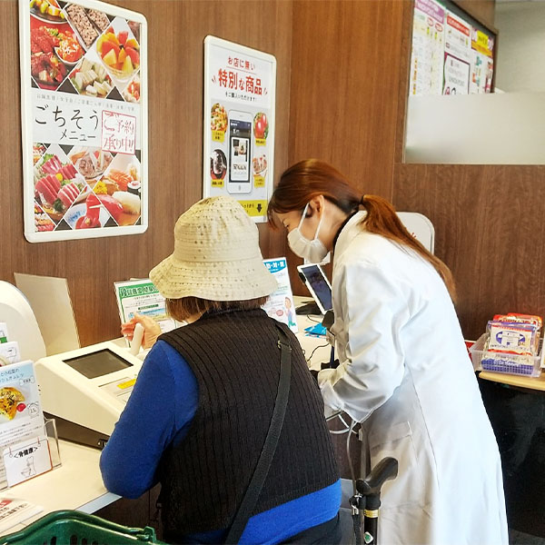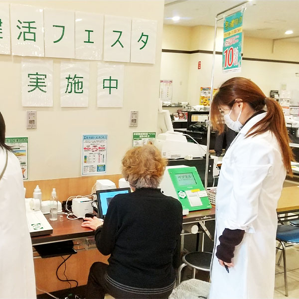 野菜の摂取量・血管年齢・骨健康度・肌年齢と筋肉量や内臓脂肪をはかることがができる体組成計の測定をしていただけます。また、測定にあわせた健康レシピも配布しています。