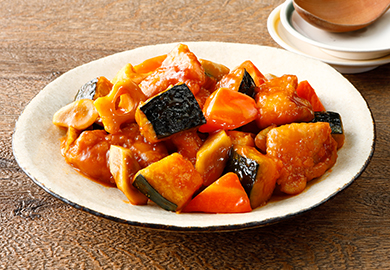 • 3.フライパンに2の野菜と、混ぜ合わせたCを入れて火にかけ、煮立ったらよく混ぜ合わせたDを入れてとろみをつけ、2の豚肉を加え、さっと混ぜ合わせて器に盛る。