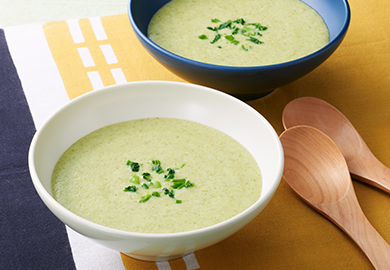 • 3.ミキサーに2を入れてなめらかになるまで撹拌し、鍋に戻して牛乳を加え、火にかけてかき混ぜながら温め、塩、こしょうをして味をととのえ、器に盛ってゆでて刻んだ七草を飾る。