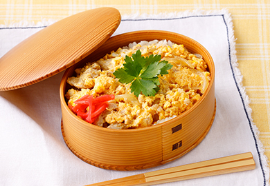 • 3.弁当箱にご飯を詰めて2をのせ、みつばを飾って紅しょうがを添える。
