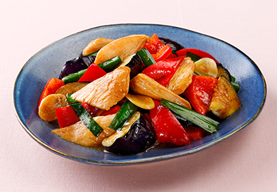 • 4.3の全体に火が通ったら、減塩しょうゆを加えて全体に味を絡め、にらを加えてさっと炒め、器に盛る。