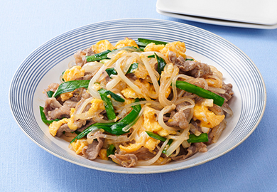 • 4.3に火が通ったら、1、2とにらを加えて手早く炒め合わせ、混ぜ合わせたAを加えて味を絡め、器に盛る。