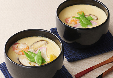 • 3.蒸気の上がった蒸し器に2を入れて乾いたふきんをかけ、ふたをして弱火で10~12分蒸して絹さやを飾る。
