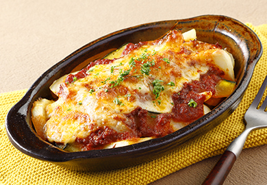• 4.耐熱容器の内側にオリーブオイルを塗り、③を入れて「ボロネーゼ」をかけ、チーズとパン粉を散らしてオーブントースターに入れ、表面に香ばしい焼き色がつくまで焼いてパセリを散らす。