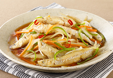 • 3.中温に熱したサラダ油に②を入れて揚げ、油をきって熱いうちに①に入れてさっと混ぜ合わせ、味がなじむまで約15分漬け込んで器に盛る。