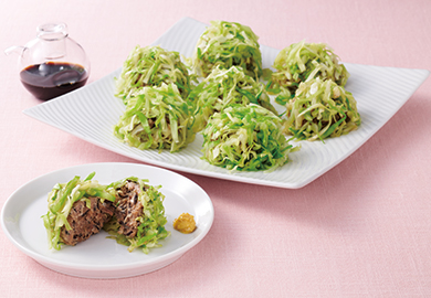 • 2.①にBを加えてさらに混ぜ、12等分にして丸め、まわりをキャベツでおおって形をととのえる。