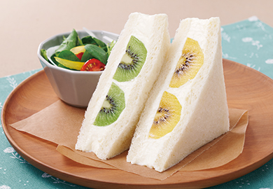 • 3.食パンの片面に②の1/4量を塗ってキウイの1個分をのせ、②の1/4量を塗り広げ、食パンを重ねてラップで包む。合計2組作り、冷蔵庫で冷やして食べやすく切る。