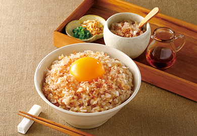 • 2.①が炊き上がったら削り節を加えて混ぜ、器に盛ってたまごを割り入れ、Aを添える。